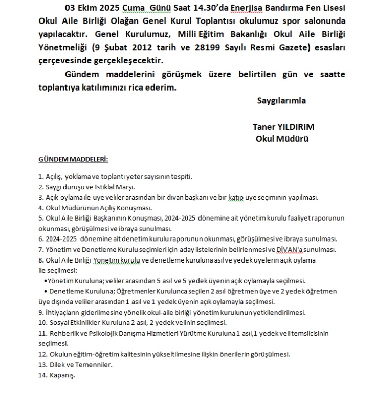 03/10/2025 Cuma Günü Okul Aile Birliği Genel Kurulu yapılacaktır. Tüm velilerimizin katılımını bekliyoruz.